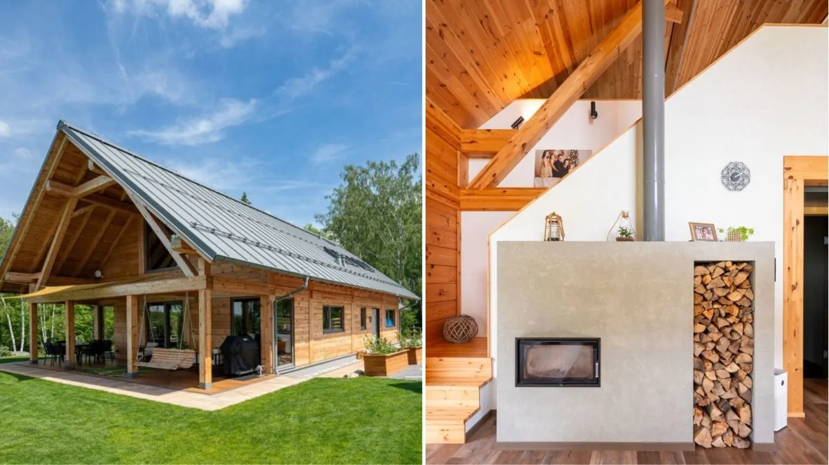 Když se manželé rozhodli postavit svůj vysněný dům, měli několik podmínek. Dům musí být dřevěný, moderní a jelikož mají malé děti, hlavně útulný. Roubenka z lepených hranolů se tak stala jasnou volbou. Už při vstupu do interiéru je jasné, že největší chloubou domu je velkorysý krb, který se stal srdcem celé dřevostavby.