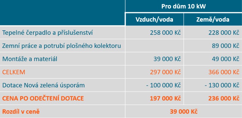 Srovnání zemního a vzduchového tepelného čerpadla v oblasti pořizovacích nákladů. Výpočet je pro dům 10 kW