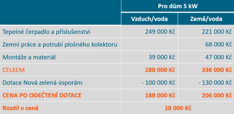 Srovnání zemního a vzduchového tepelného čerpadla v oblasti pořizovacích nákladů. Výpočet je pro dům 5 kW