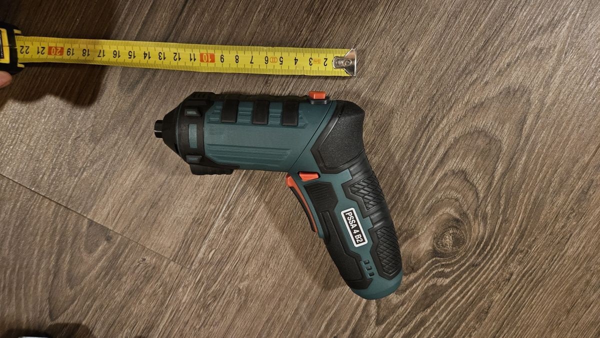 V tvaru do „L“ má hlavní část délku asi 14 cm. Přibližně stejnou délku má i držátku. V nastavení do válcovitého tvaru pak je celková délka kolem 23 cm. Kufřík, ve kterém je aku šroubovák složen je proto poměrně malý a skladný pro umístění na libovolné potřebné místo.
