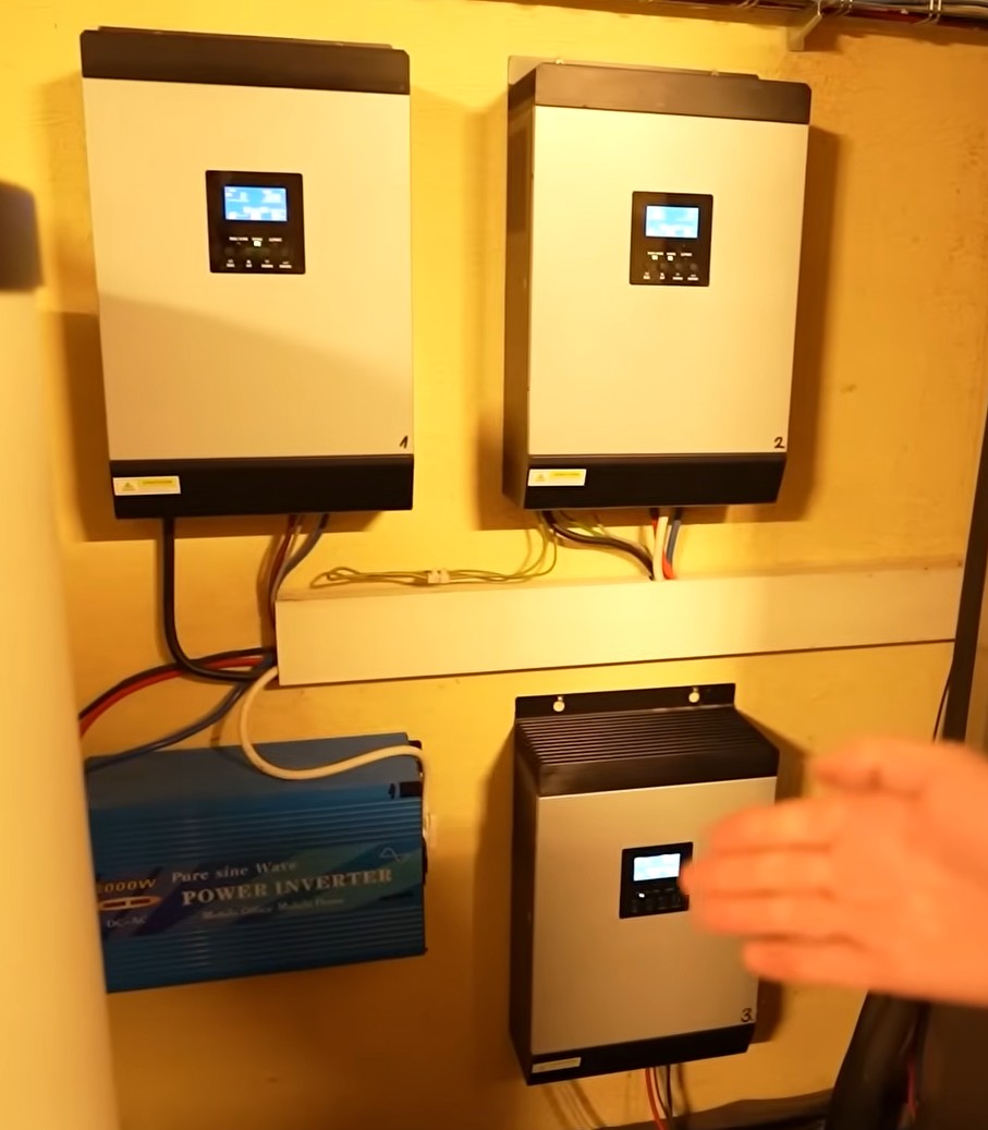 Dále je zde osm baterií a jednotlivé pole střídačů, jejich počet bylo nutné postupně navyšovat