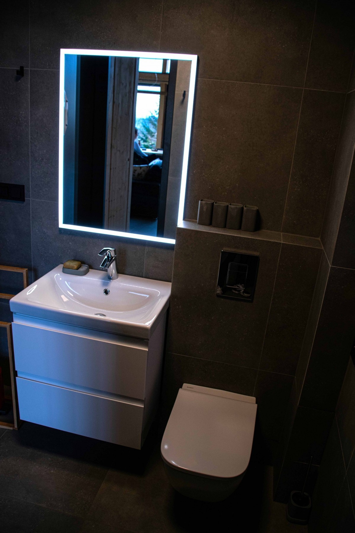 Moderní koupelna se sprchovým koutem s tmavě šedými obklady. V koupelně nechtěli stěnu u sprchového koutu, sprcha je vyspádovaná do žlábků