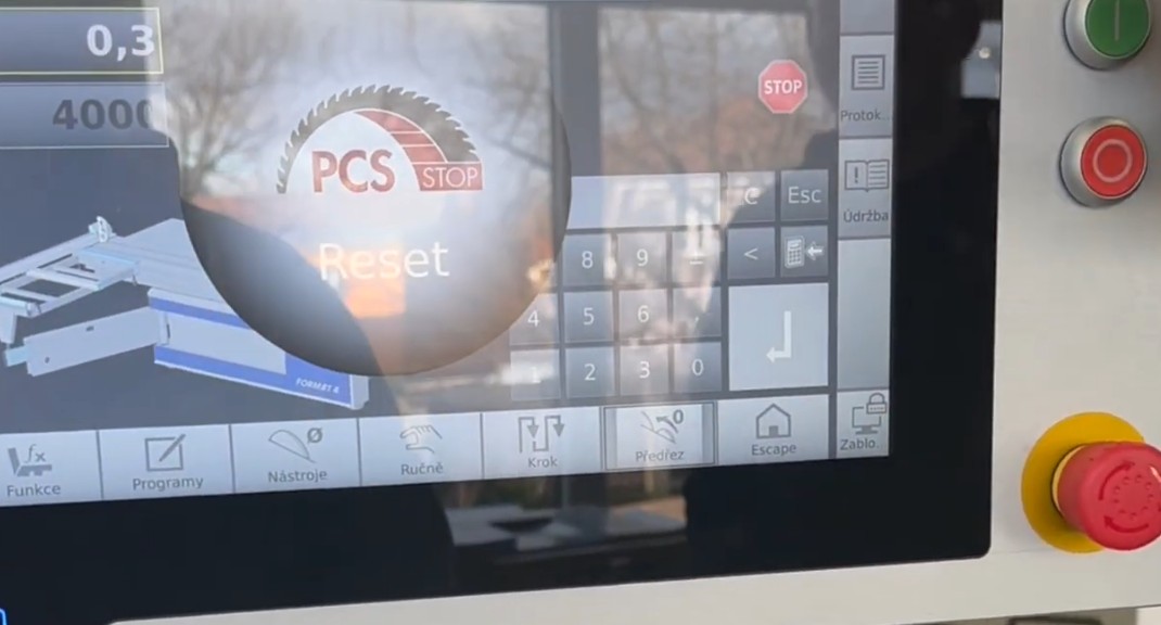 Po zásahu bezpečnostního systému se na displeji pily zobrazí výzva k resetu, po němž lze během desítek vteřin pokračovat v práci