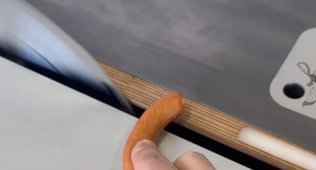 Bezpečnostní systém stolní pily při kontaktu s párkem okamžitě zastavil kotouč a zabránil jeho proříznutí