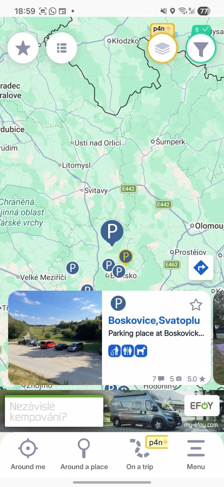 Kliknutím na ikonu místa, kde lze bezplatně přespat, se ukáží detailní informace na dolní straně obrazovky