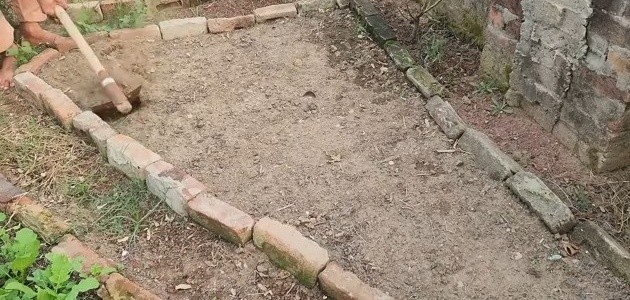 Půda se nejprve rozvolní motykou, aby vznikla struktura vhodná pro začlenění biouhlu a kompostu