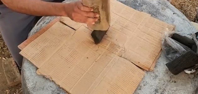 Biouhel se rozbije nebo rozdrolí na menší kousky, aby se lépe smíchal s kompostem a rovnoměrně zasáhl půdu