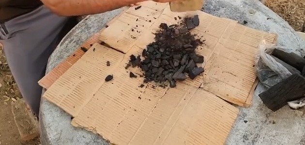 Rozdrcený biouhel se sesbírá do hromádky připravené k smíchání s kompostem a dalším organickým materiálem