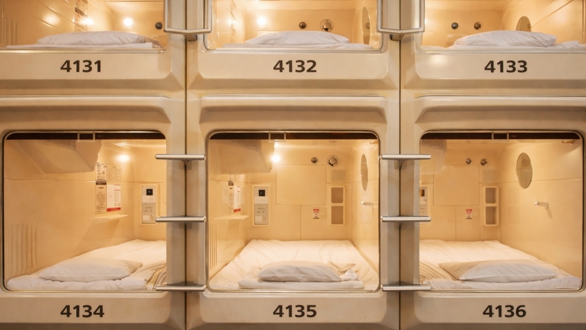 Japonské metropole dlouhodobě bojují s nedostatkem volných stavebních parcel. Původním řešením tohoto problému se staly takzvané kapslové hotely. Tyto úzké buňky ze sklolaminátu a plastu měly zpočátku sloužit pouze k jednorázovému přespání pro unavené úředníky. Dnes se však stávají i nouzovým řešením pro lidi ve složité životní situaci. Cena za jednu noc se obvykle pohybuje mezi 2 000 až 5 000 jeny, což odpovídá přibližně 300 až 800 korunám. Při dlouhodobém využívání se tak měsíční náklady mohou vyšplhat zhruba na 9 000 až 24 000 korun, což z nich nedělá vyloženě levné bydlení. Za tuto částku získá člověk prostor o rozměrech dva metry na délku a metr na šířku. Uvnitř najde tenkou matraci, malou poličku, elektrickou zásuvku a obrazovku. Sociální zařízení a umývárny sdílejí obyvatelé celého patra. Život v takovém prostředí vyžaduje absolutní minimalismus. Obyvatel si smí přinést jen základní oblečení a hygienické potřeby. Větší osobní věci a boty si lidé trvale ukládají v uzamykatelných skříňkách ve vstupní hale budovy.