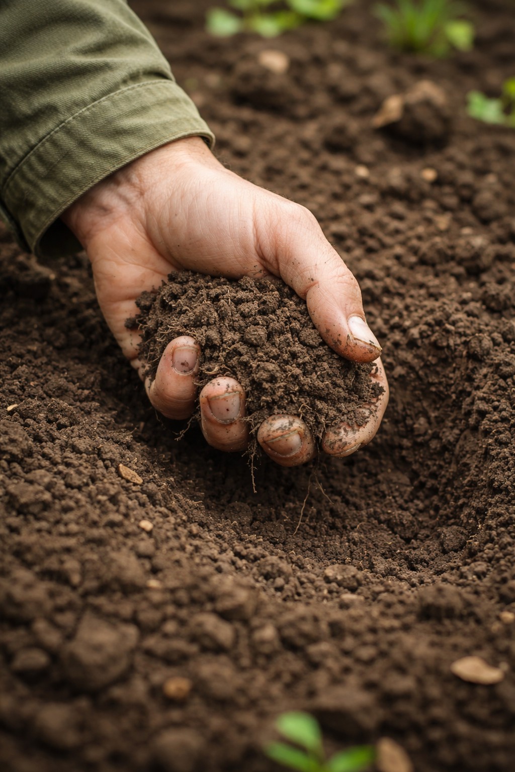 Vezměte hrst půdy, ideálně z hloubky cca 5–10 cm (ne jen úplně z povrchu). Lehce ji zmáčkněte v dlani, nestlačujte silou, jen přirozeně sevřete