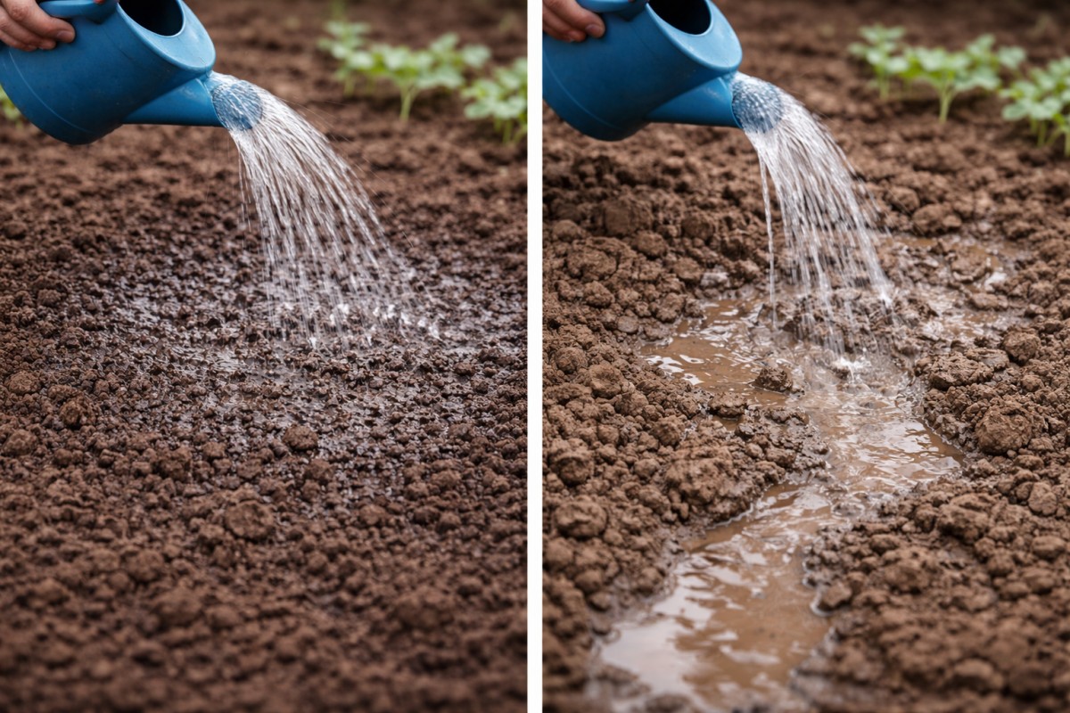 Vlevo voda rychle vsakuje do kypré půdy, vpravo na zhutněném povrchu zůstává a odtéká pryč. Právě dobrá vsakující půda zajišťuje, že se vláha dostane ke kořenům