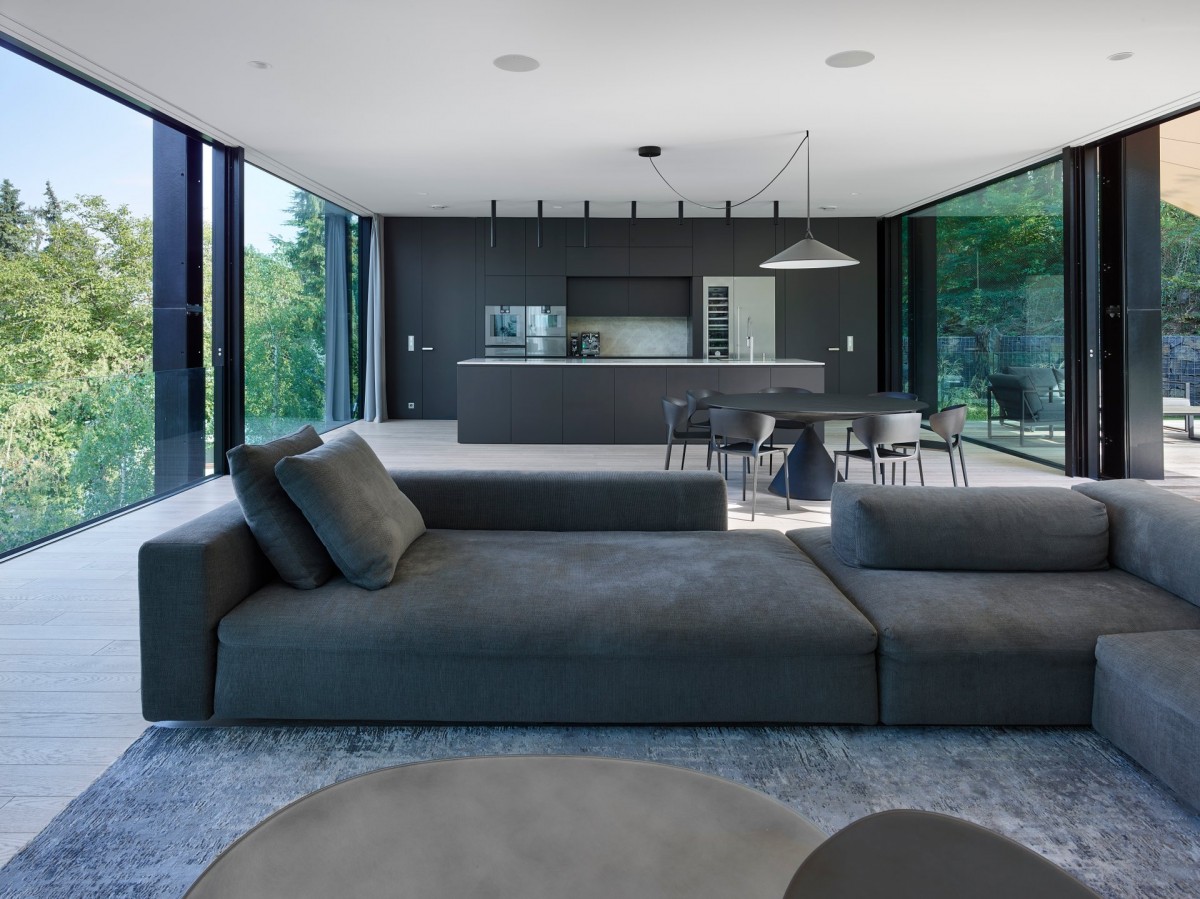 Dům spočívající na dvojici železobetonových pilířů jako most překonává terénní rozdíl a otevírá panoramatické výhledy na krajinu Českého krasu i vzdálenou Prahu