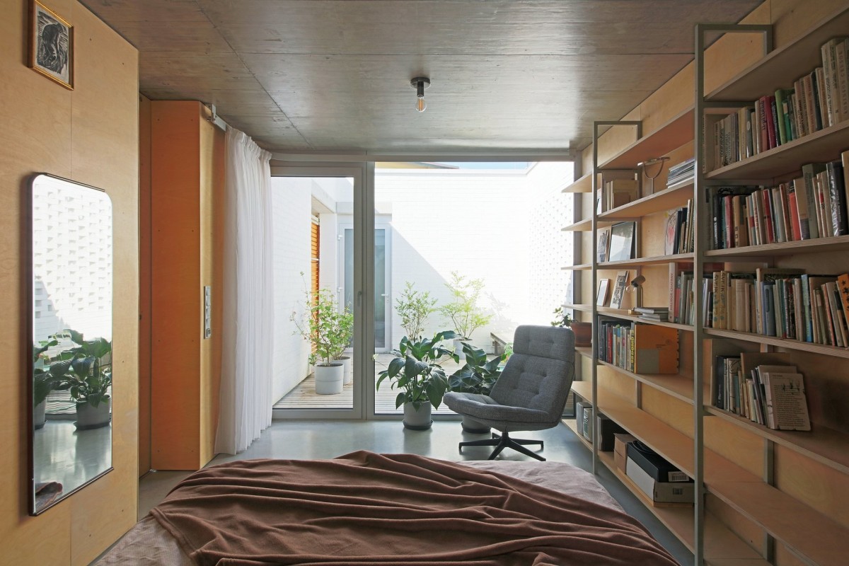 Materiálová střídmost, betonová podlaha a dřevěné a překližkové prvky vytvářejí klidnou atmosféru jednoduchého, ale promyšleného domova