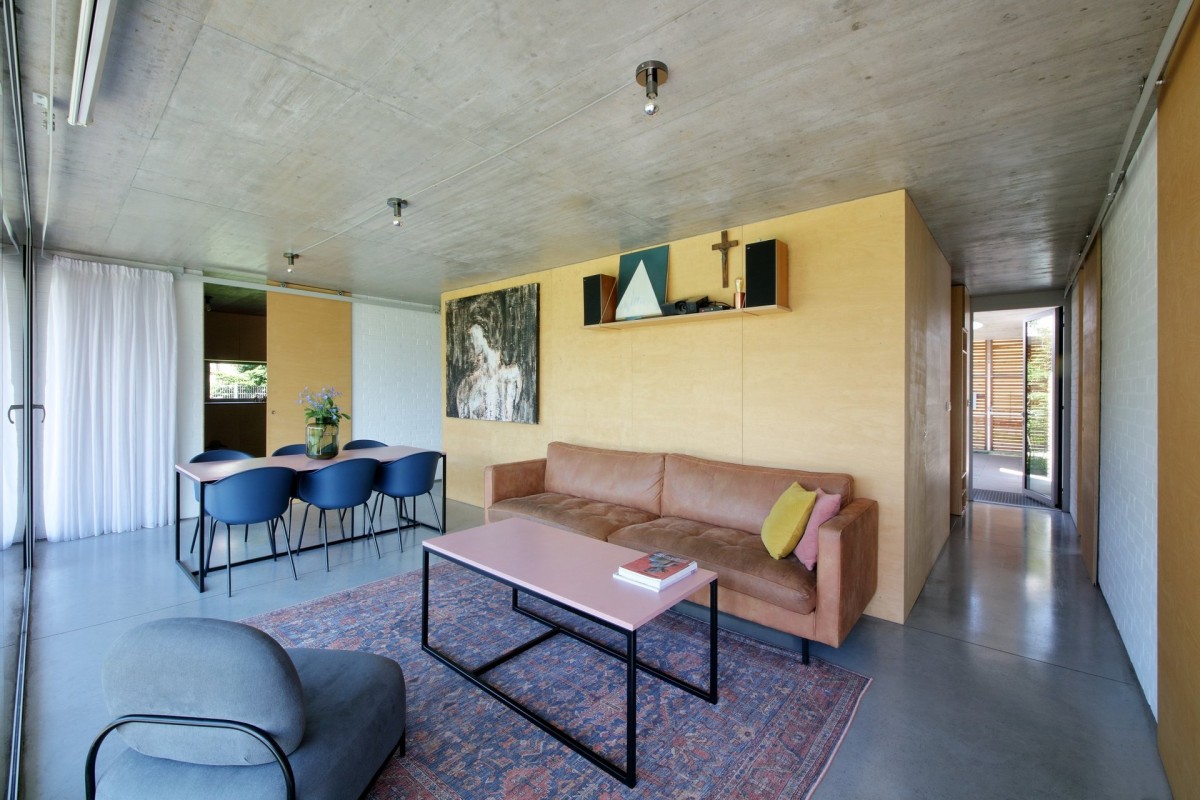 Dispozice ve tvaru H odděluje soukromé části domu – dětské pokoje a ložnici rodičů – od středové obytné zóny, která propojuje vstupní patio, kuchyň a obytný prostor s terasou