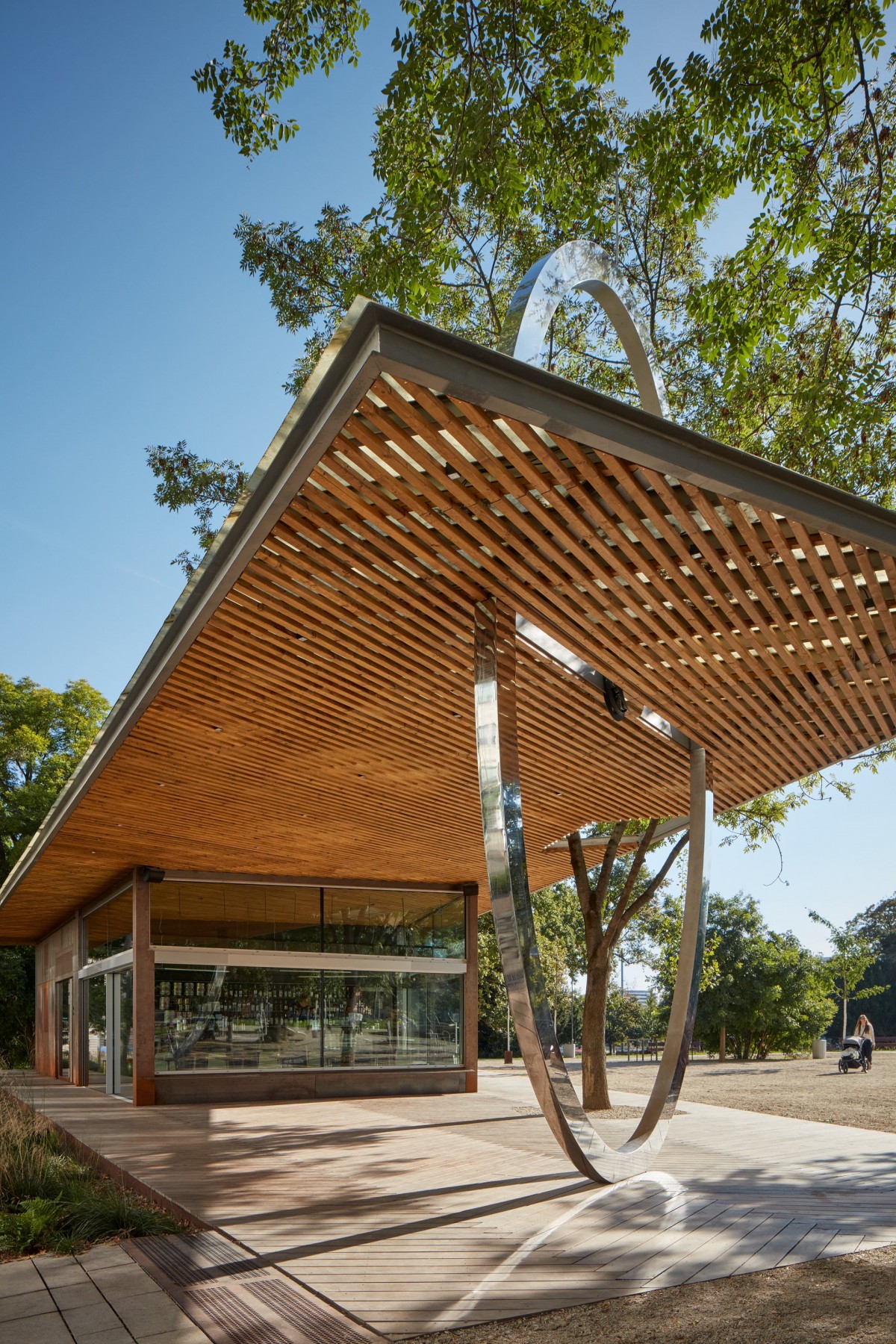 Na okrajích parku stojí kavárna s dětským hřištěm a menším amfiteátrem, čímž se prostor otevírá městskému životu a získává novou společenskou funkci
