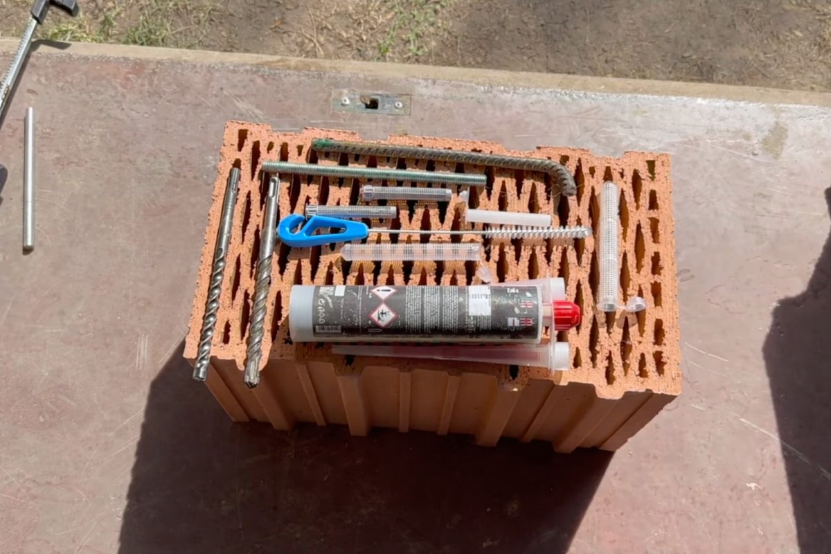 Vidět je kartuše s dvousložkovou chemickou hmotou, směšovací trubičky, speciální sítkové hmoždinky, závitové tyče a roxor i vrtáky odpovídajícího průměru. Právě kombinace správného vrtáku, vyčištěného otvoru a vhodné hmoždinky je podle odborníků klíčová pro to, aby chemická kotva v duté cihle skutečně fungovala. Při nesprávné aplikaci nebo použití nevhodného systému kotvení může spoj pouze zdánlivě držet a následně selhat.