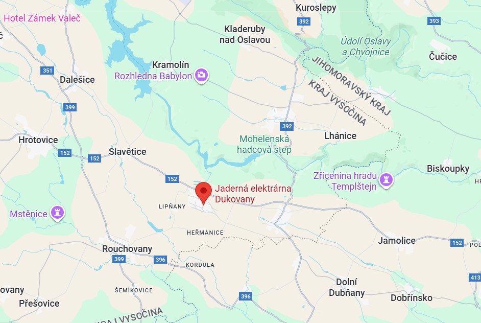 Jaderná elektrárna Dukovany leží na pomezí Kraje Vysočina a Jihomoravského kraje u obcí Dukovany a Rouchovany