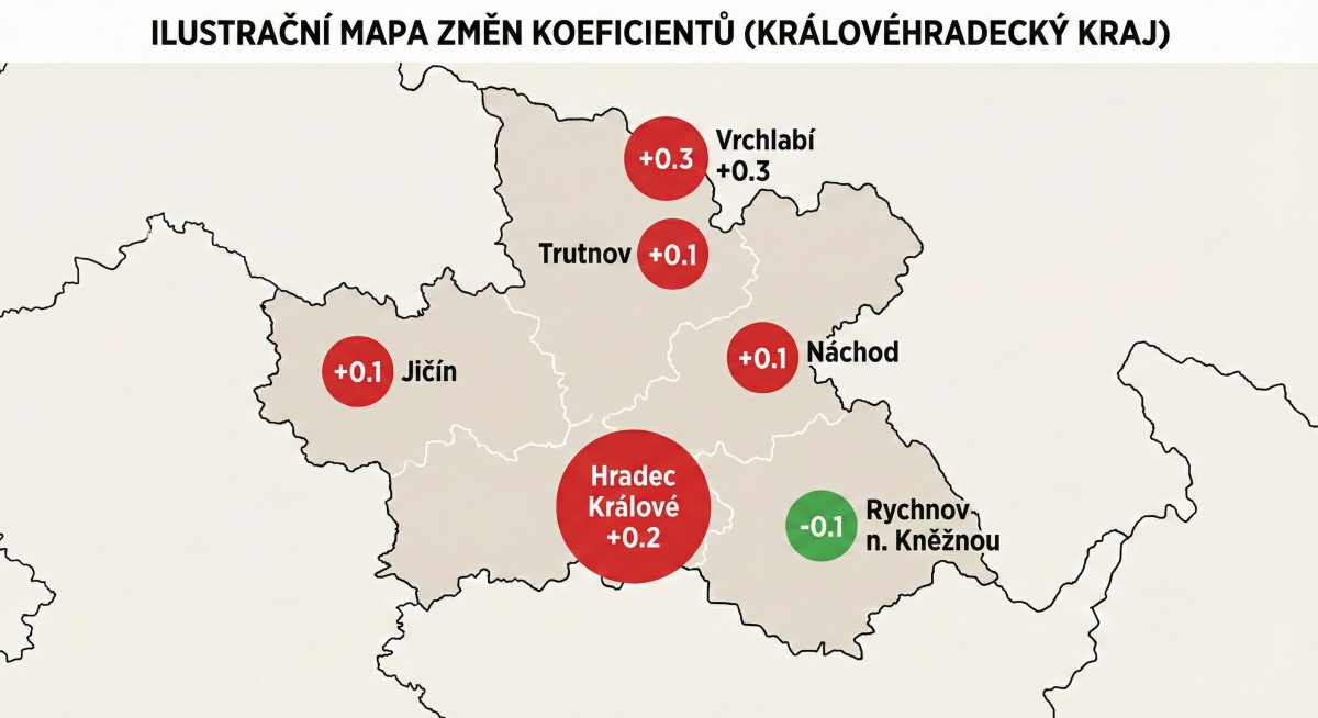 Ilustrační mapa ukazuje změny koeficientů daně z nemovitých věcí ve vybraných městech Královéhradeckého kraje pro rok 2026
