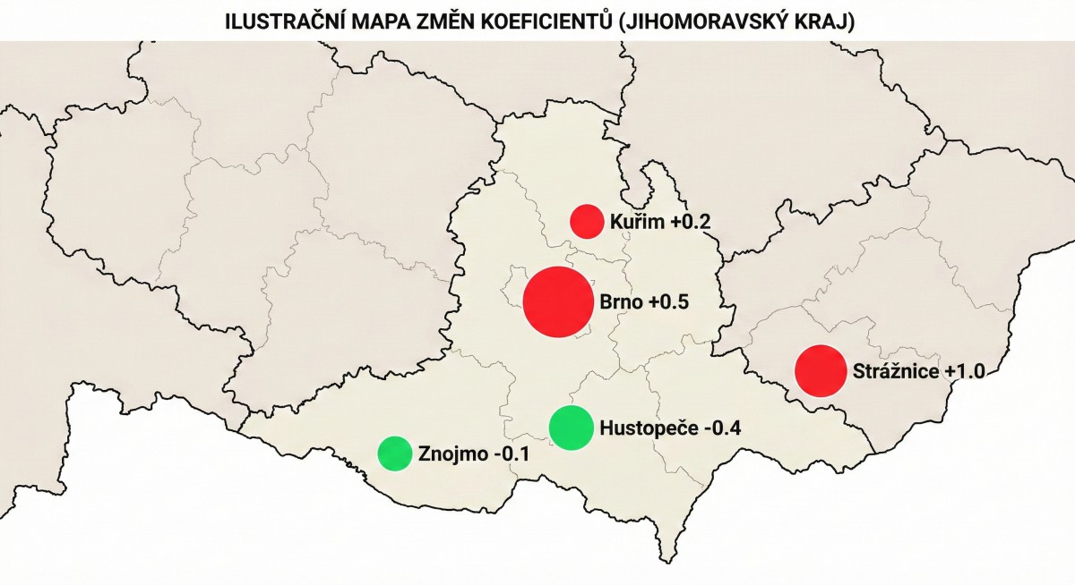 Mapa znázorňuje, jak se ve vybraných městech Jihomoravského kraje v roce 2026 změní koeficienty daně z nemovitých věcí