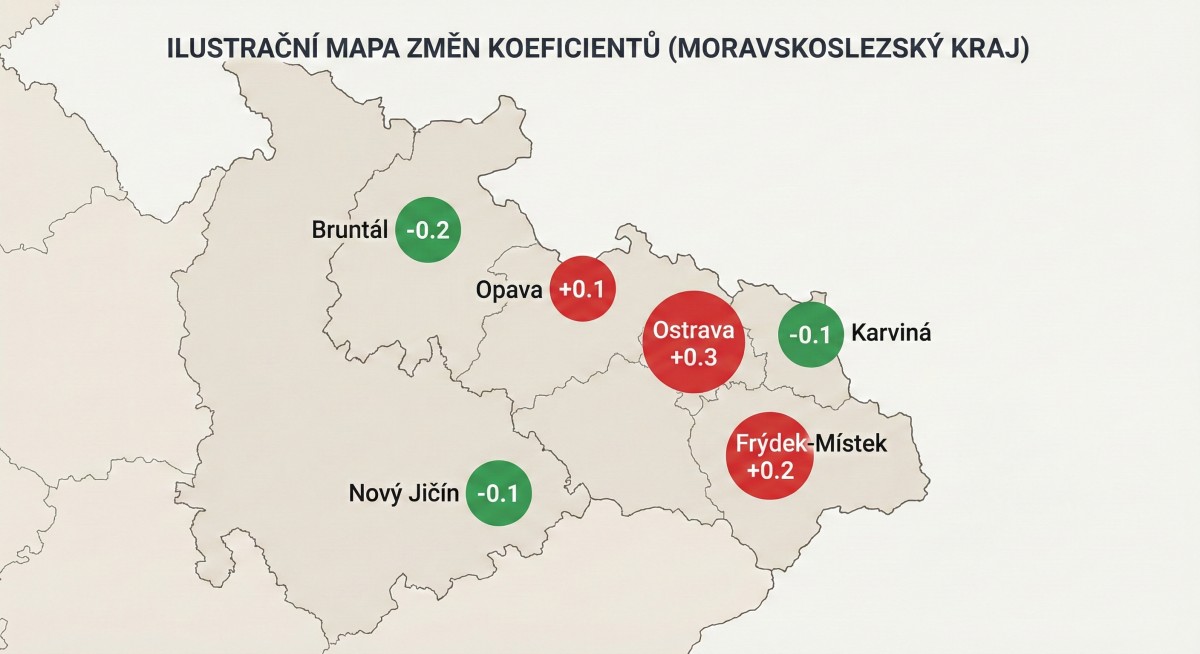 Ilustrační mapa přehledně ukazuje, kde se ve vybraných městech Moravskoslezského kraje koeficient daně z nemovitých věcí pro rok 2026 zvyšuje a kde naopak klesá