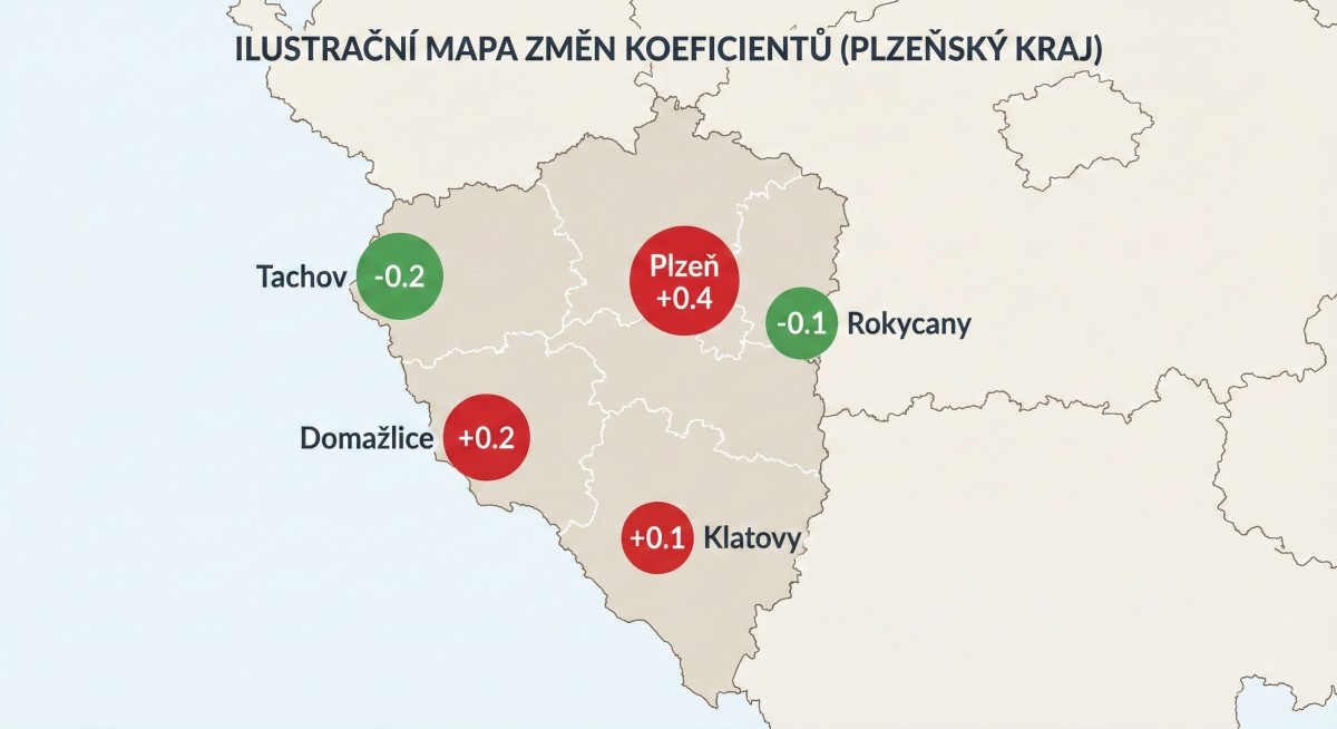 Ilustrační mapa ukazuje změny koeficientů daně z nemovitých věcí ve vybraných městech Plzeňského kraje pro rok 2026