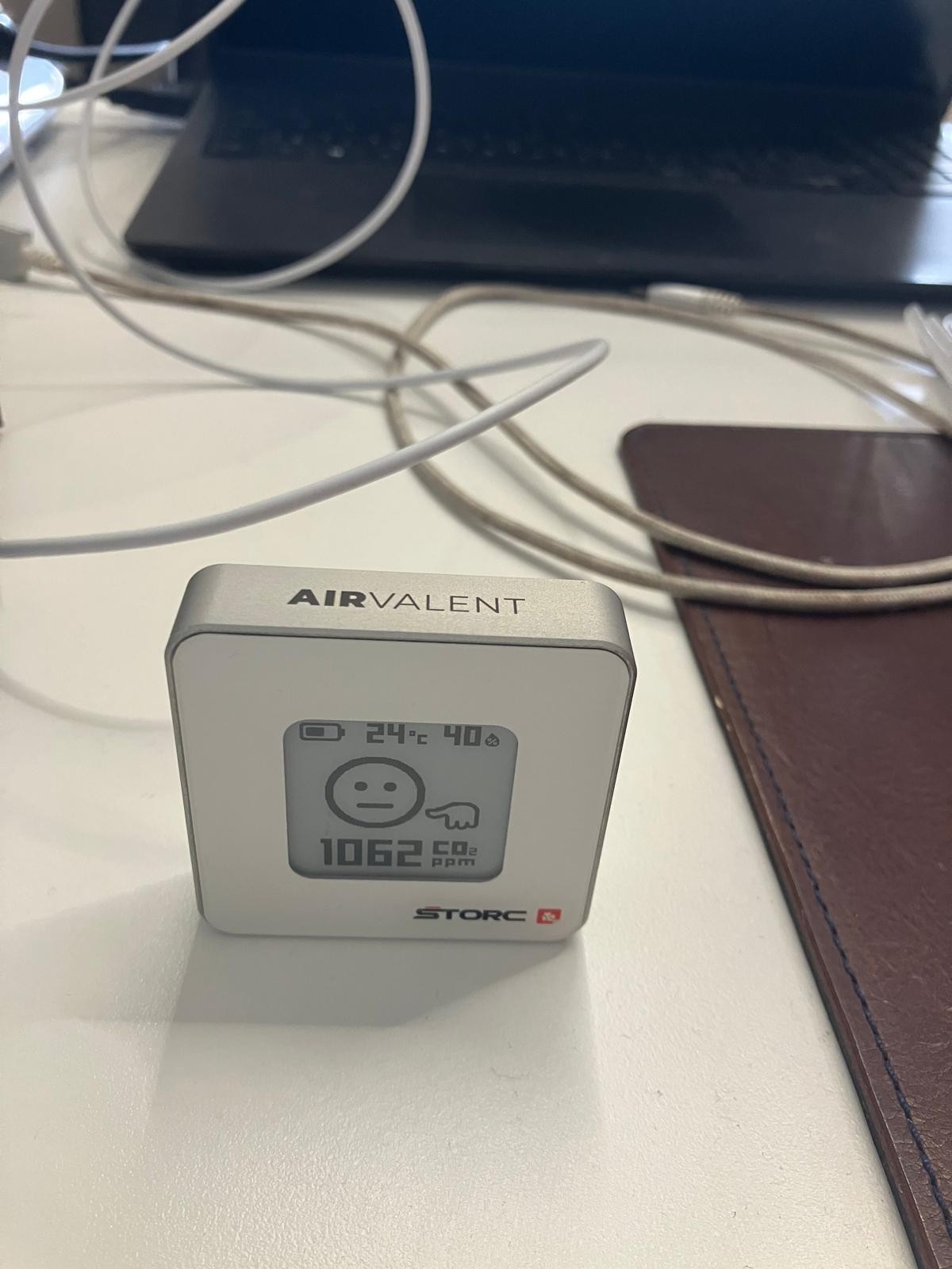 V 11 hodin čidlo ukazovalo 1062 ppm a koncentrace tak překročila hranici, kdy je vzduch považován za kvalitní. Smajlík na čidlu začal trochu ztrácet úsměv