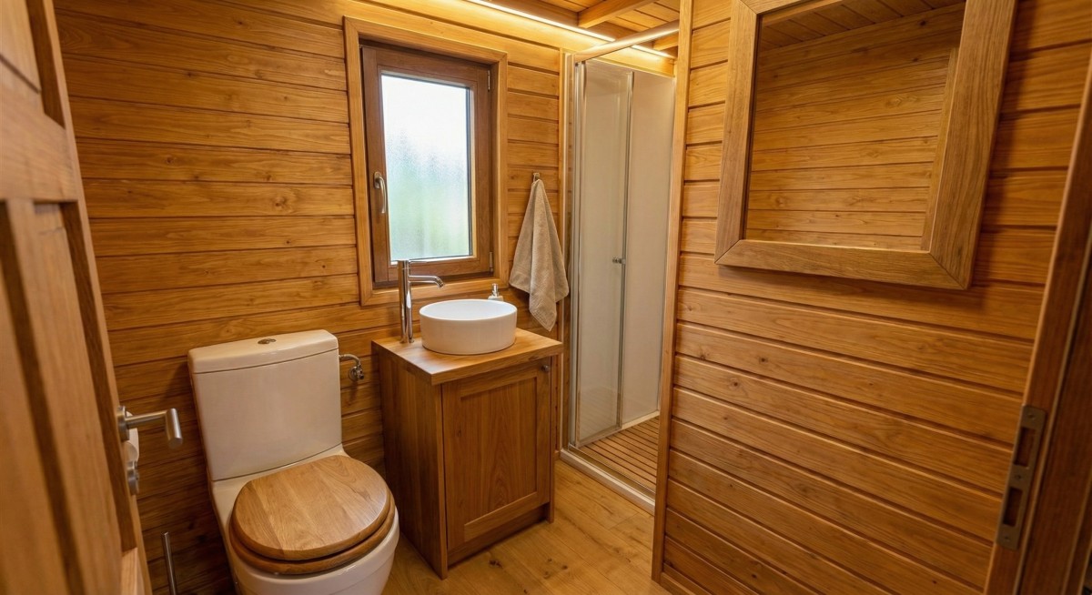 Domek byl vybaven i toaletou s umyvatlem a sprchou