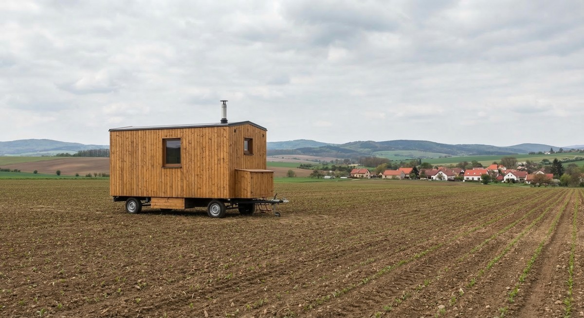 Ukázkou absolutní neznalosti zákonů je toto umístění domku na kolečkách na orné půdě