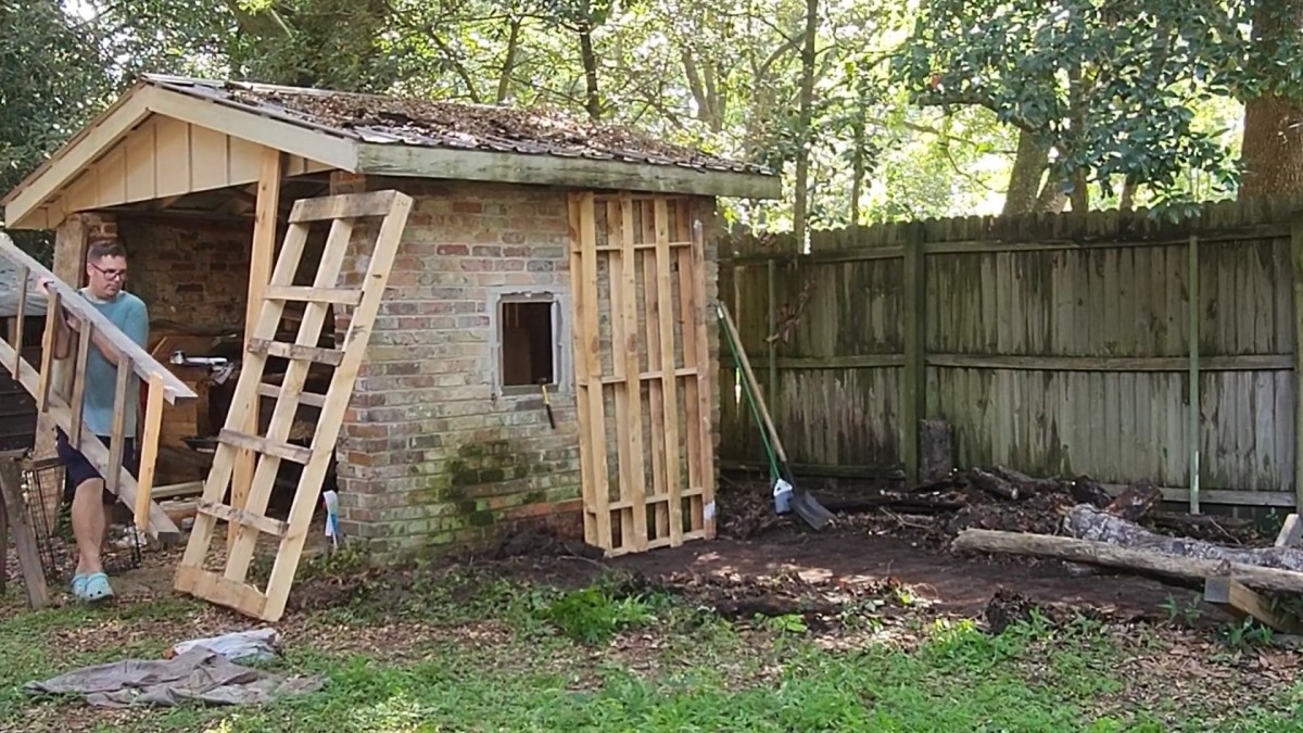 Na připravené místo přináší palety pro budoucí konstrukci dřevníku. Stavba využívá dostupný materiál, který měl majitel po ruce