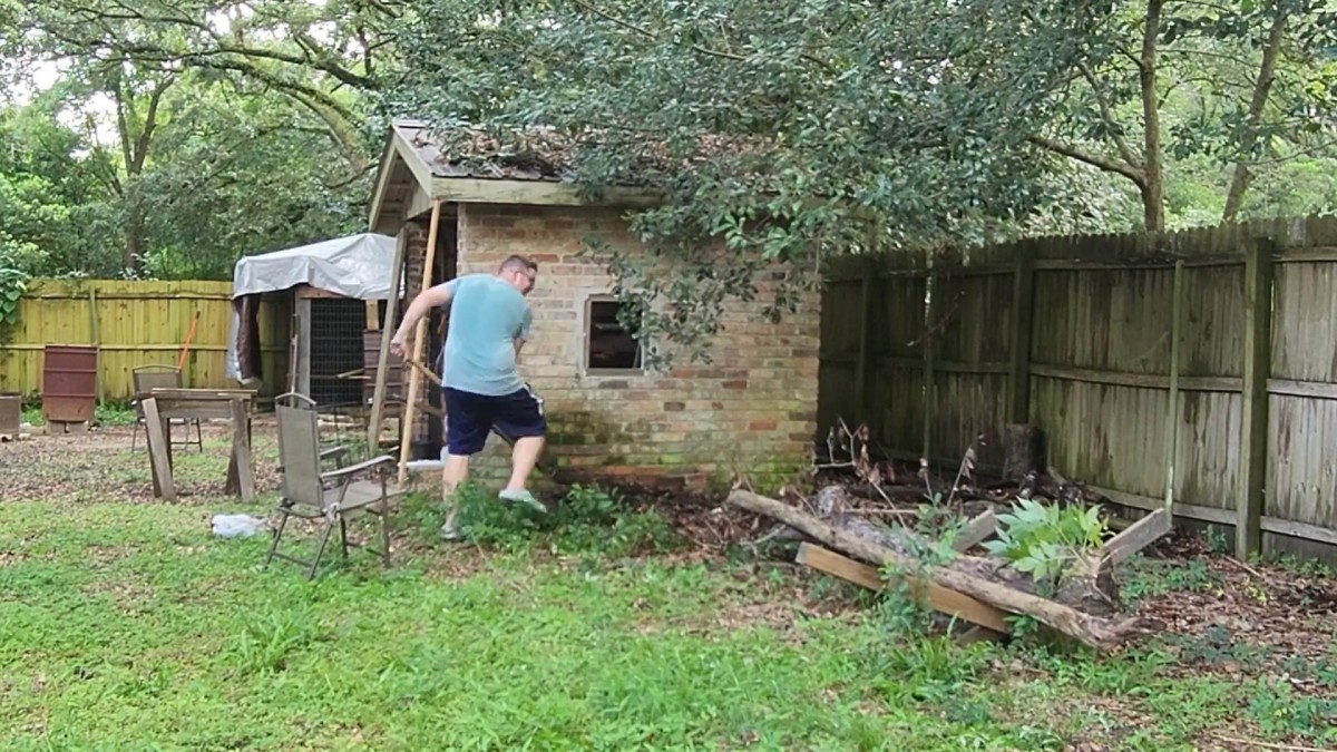 Majitel se pouští do vyklízení prostoru podél zdi, kde bude dřevník stát. Odstraňuje kmeny a nepořádek, aby připravil pevný a čistý základ pro stavbu