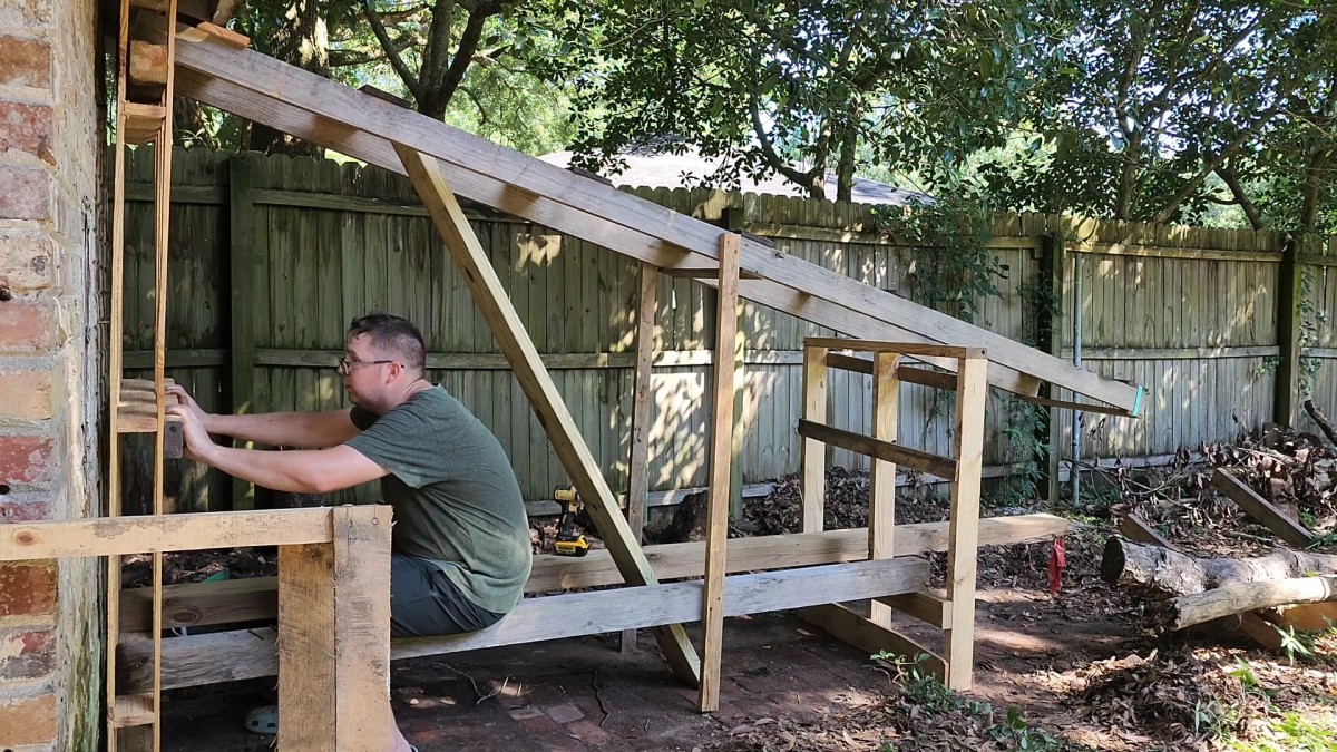 Konstrukci postupně zpevňuje a kotví ke zdi, aby celek držel jako jeden pevný rám. Doplňuje i šikmé vzpěry, které omezí kývání a výrazně zvýší stabilitu dřevníku