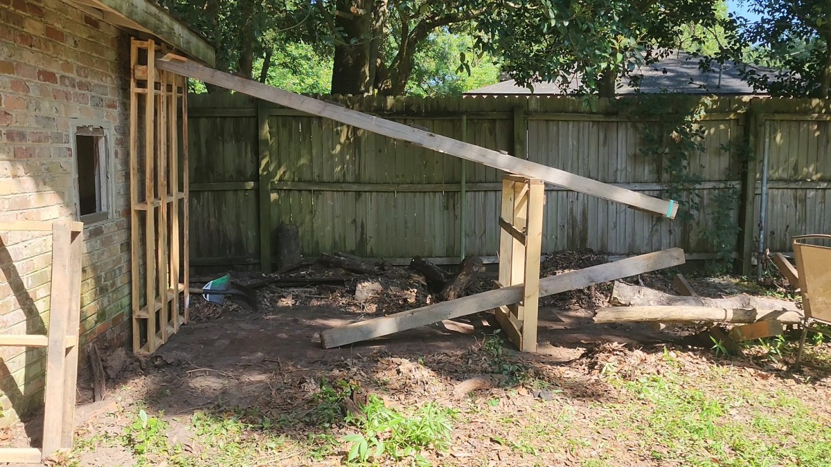 Konstrukce už má jasně daný tvar pultové střechy opřené o zeď. Jednoduché řešení šetří materiál a připravuje prostor pro dobře větraný dřevník