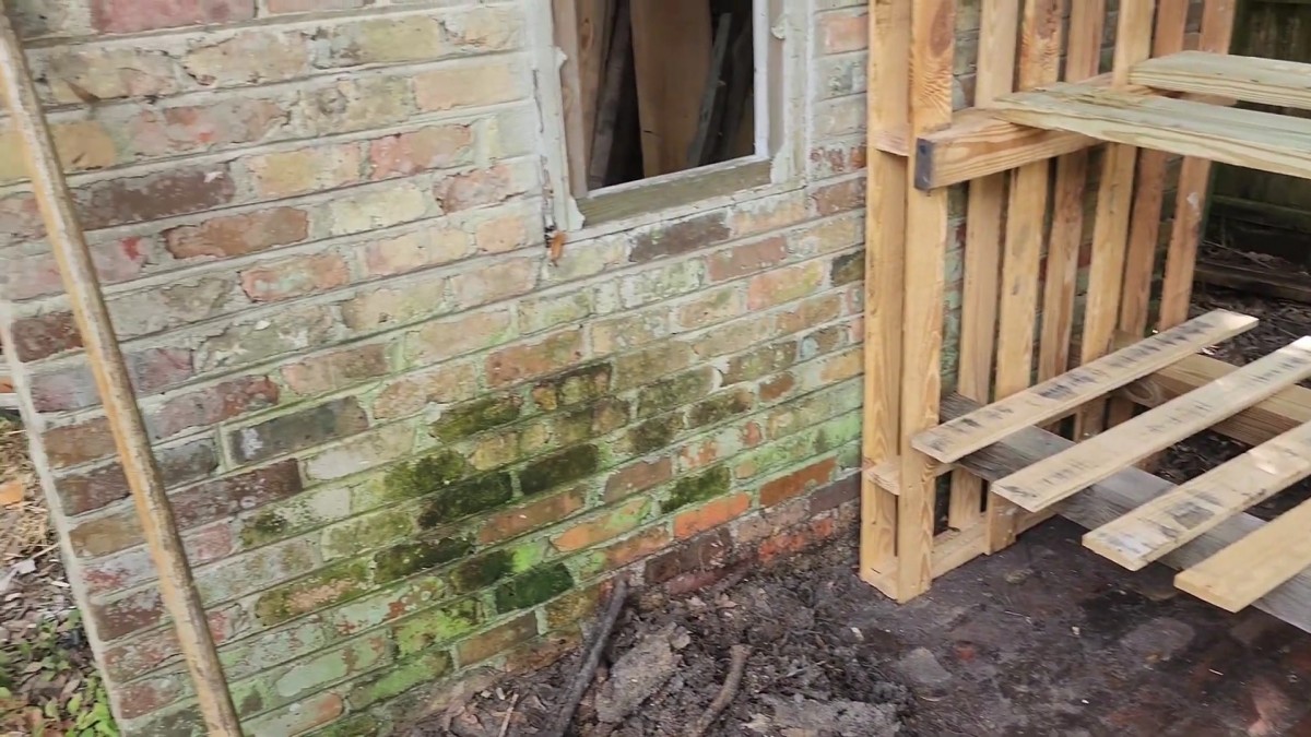 Dřevník je umístěný těsně u zdi, která slouží jako zadní opora celé konstrukce. Otevřené boky a mezery v paletách zároveň umožňují proudění vzduchu