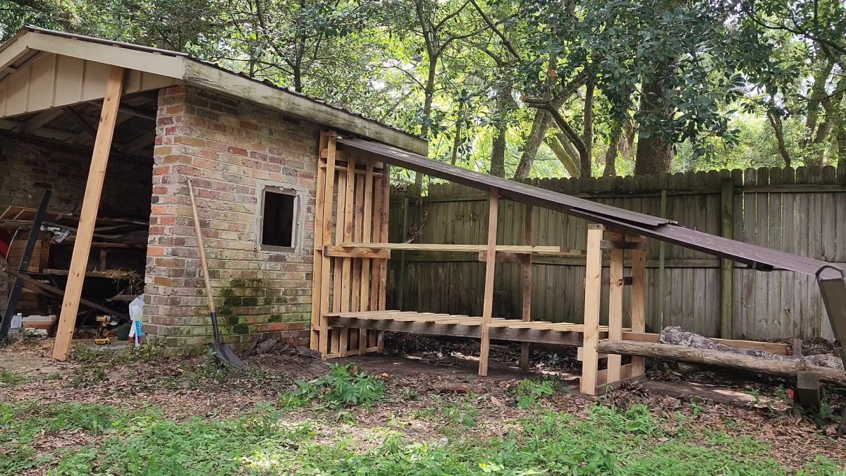 Hotový dřevník opřený o zeď využívá jednoduchý lean-to tvar a minimum materiálu. Otevřená konstrukce a šikmá střecha zajišťují rychlé schnutí dřeva i ochranu před deštěm