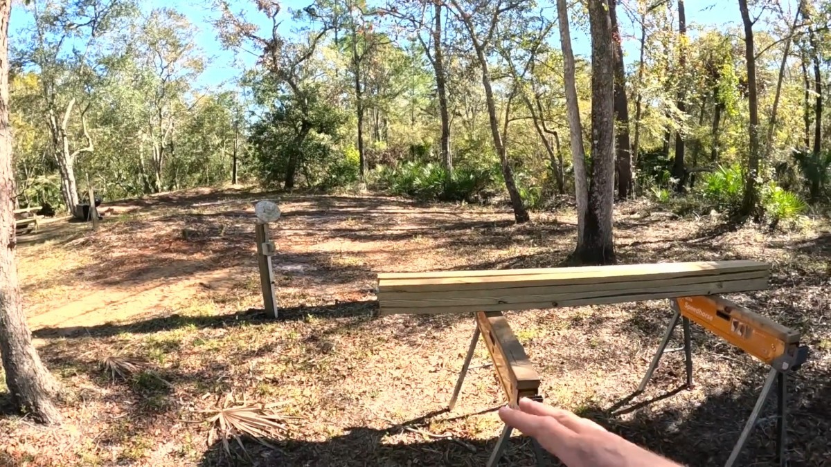 Ruční pilou nařežeme dřevěná prkna. Připravíme si tak v přírodě nezbytný základní materiál pro stavbu našeho stojanu na palivové dříví.