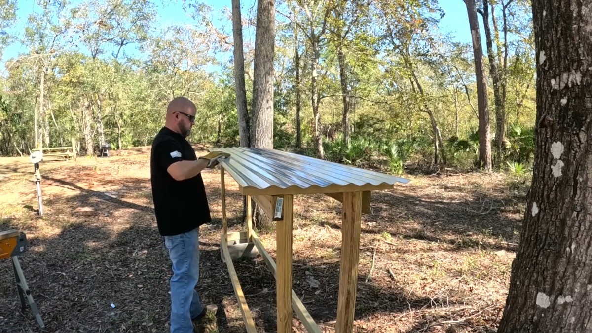 Pokračujeme v instalaci plechové střechy. Pečlivým přišroubováním plechu zajistíme, že naše střecha bez potíží odolá i silnějšímu větru.