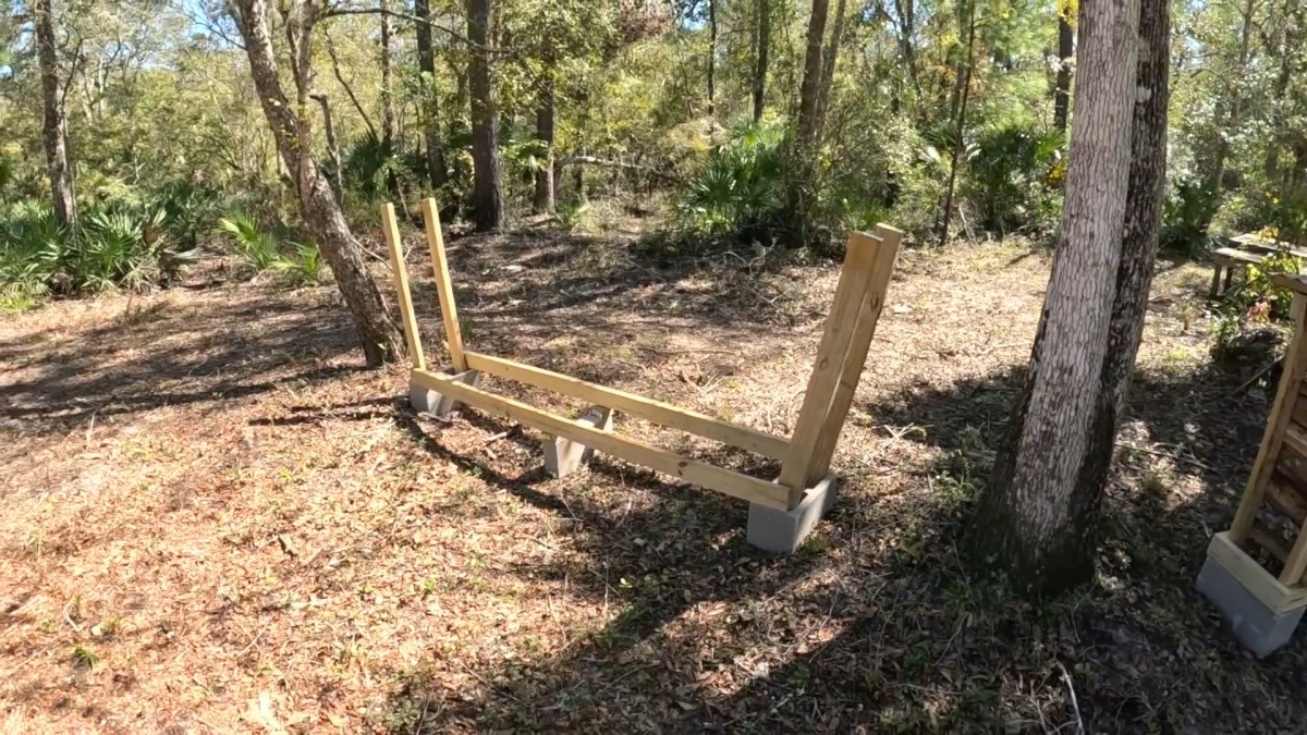 Celkový pohled na původní jednoduchý stojan typu V uprostřed lesa. I bez spojovacích materiálů vypadá naložený dřevem velmi stabilně.