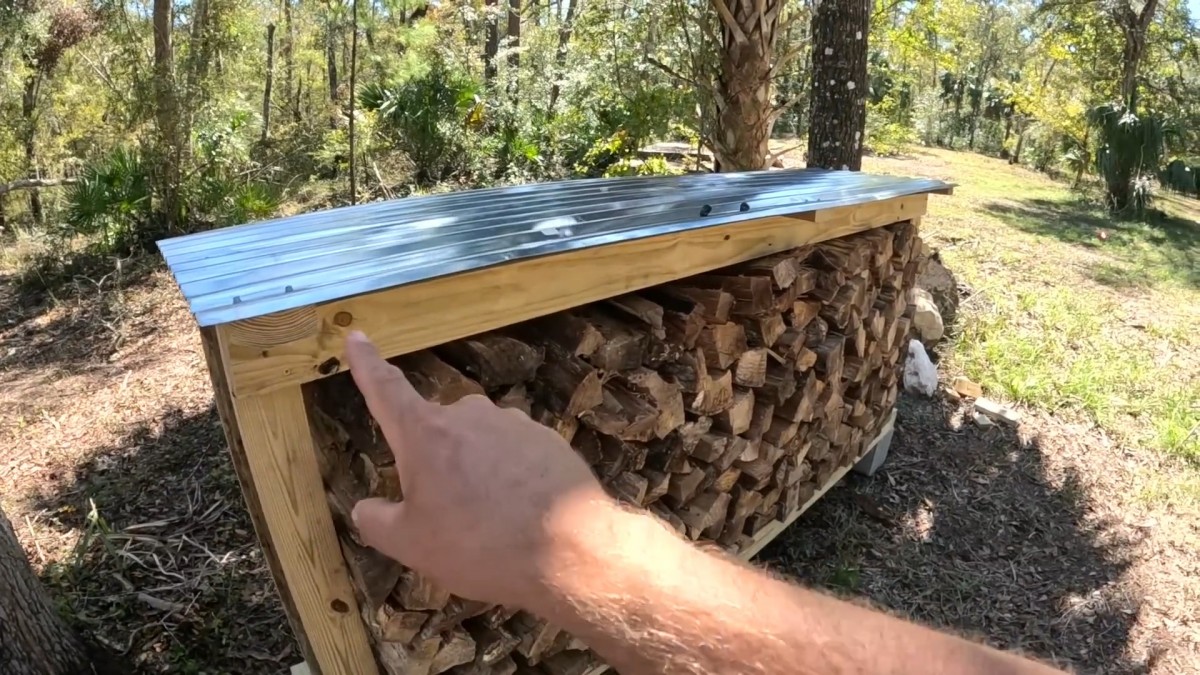 Detailní záběr na úhledně přeskládané palivové dříví, které je nyní perfektně chráněné pod nově nainstalovanou vlnitou plechovou střechou.