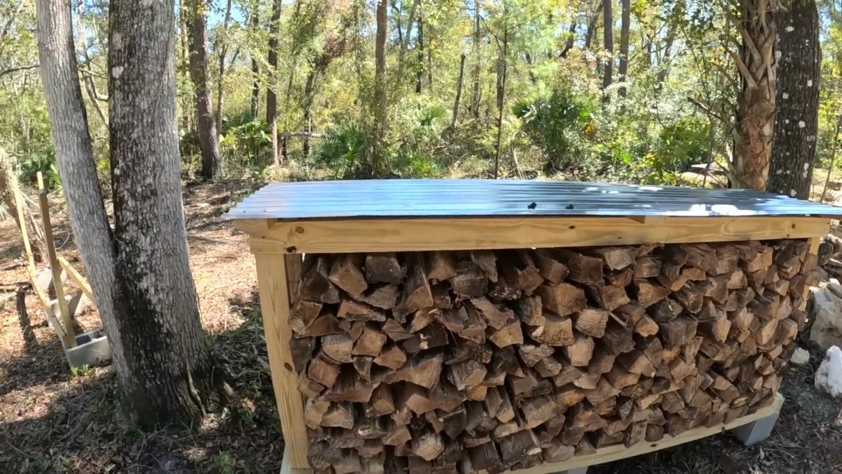 Máme hotovo. Plný zastřešený stojan na pozadí stromů ukazuje, že tento náš povedený kutilský projekt za pár desítek dolarů je u konce.