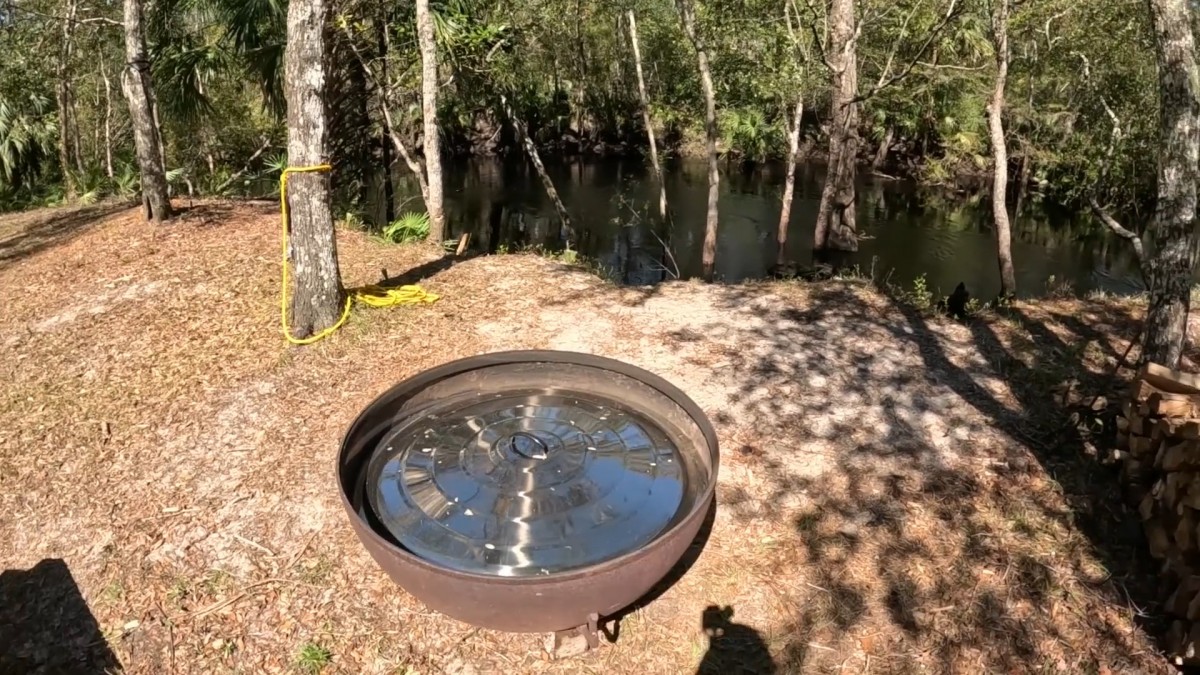 Detailní pohled na venkovní kovové ohniště, kde brzy najde uplatnění naše palivové dříví. Jde o skutečně krásné a naprosto klidné místo.