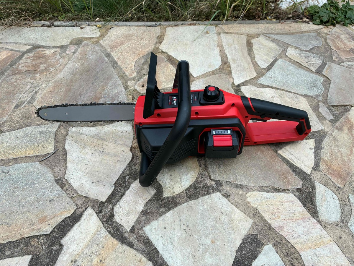 Moderní aku pila připravená do akce. Jitka díky ní zvládla zásobu dřeva bez hluku i zápachu