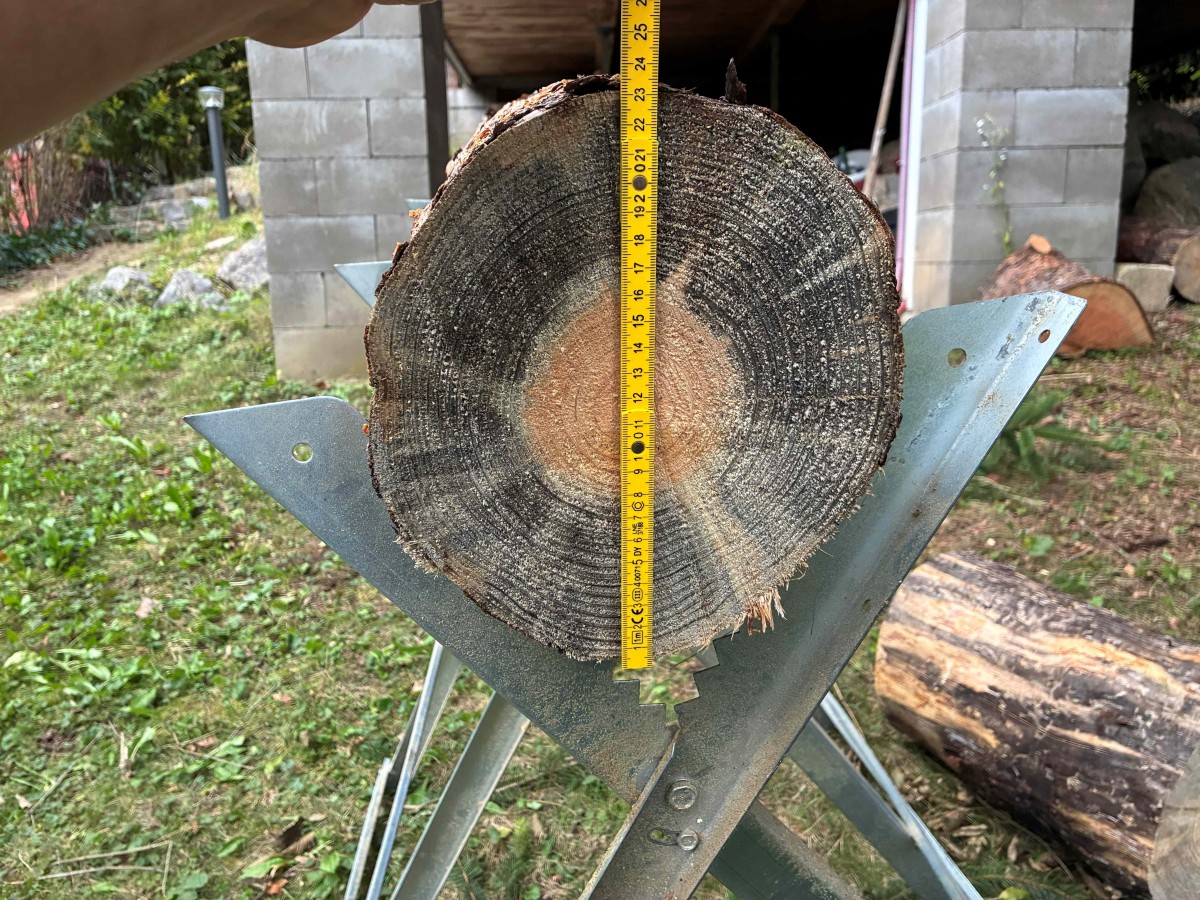 Měřením si Šimon ověřil, že pila zvládne i pořádné kusy dřeva. Průměr přes dvacet centimetrů ji už nezaskočí
