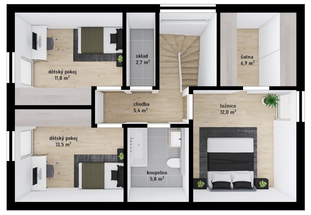 V patře se poté nachází menší chodba, ze které se dále dostanete do dvou dětských pokojů, komory, koupelny s toaletou a do ložnice s šatnou