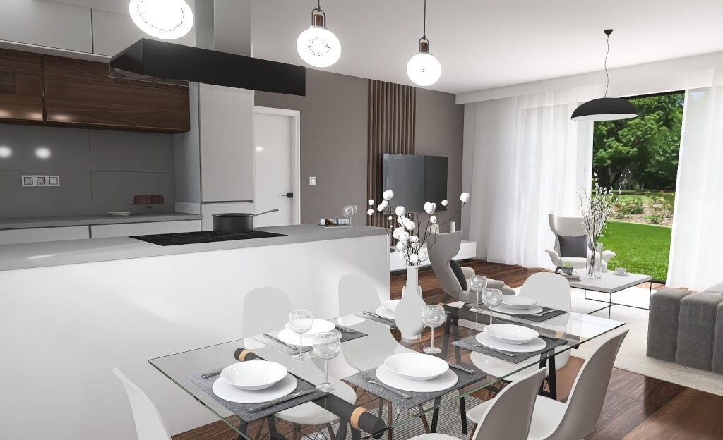 Obývací pokoj s jídelnou a kuchyní zaujímá celkem 33,5 m2