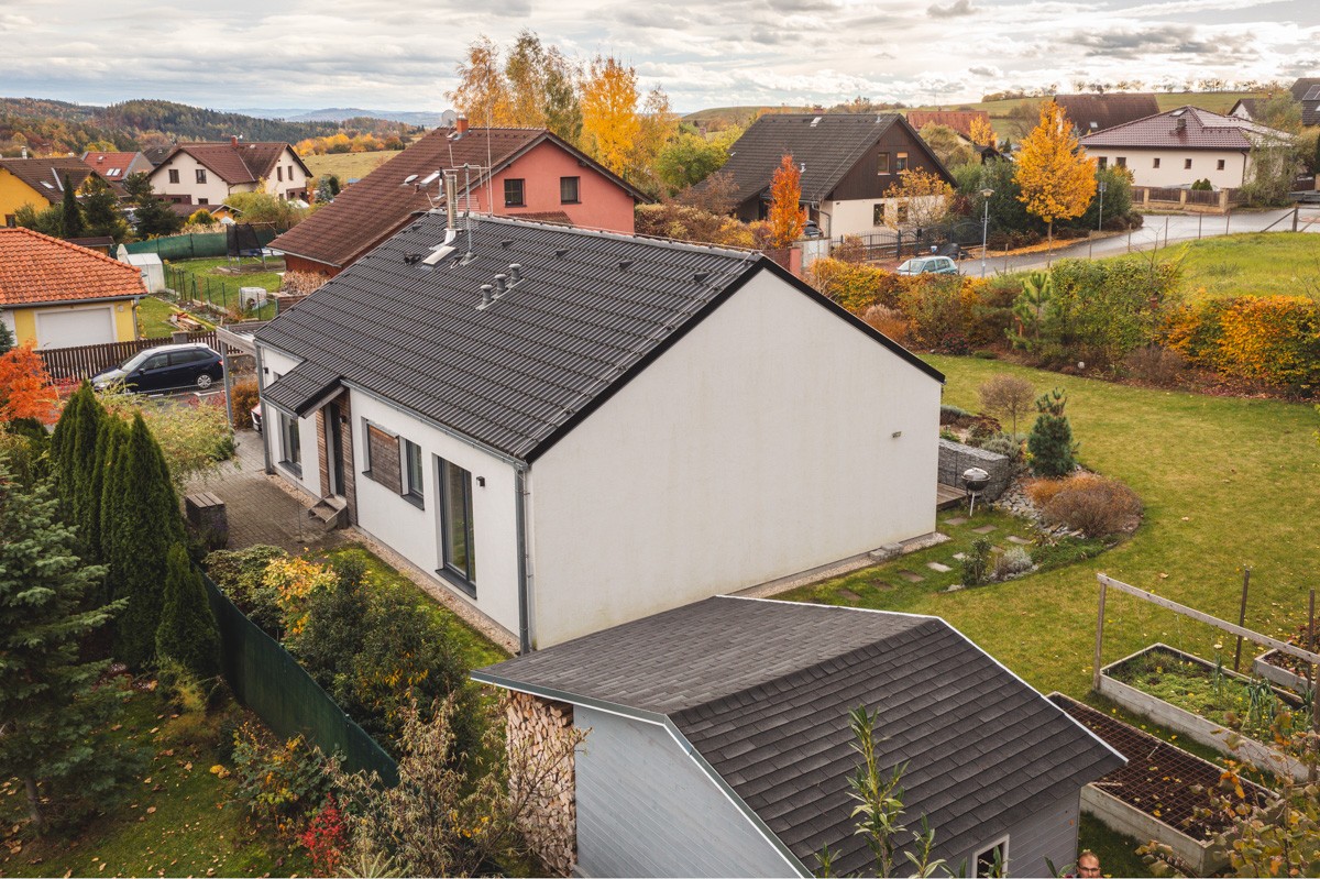Skromný bungalov majitelů s dispozicí 4+kk zaujímá plochu 9 x 13 m. Jedná se o prostý obdélník