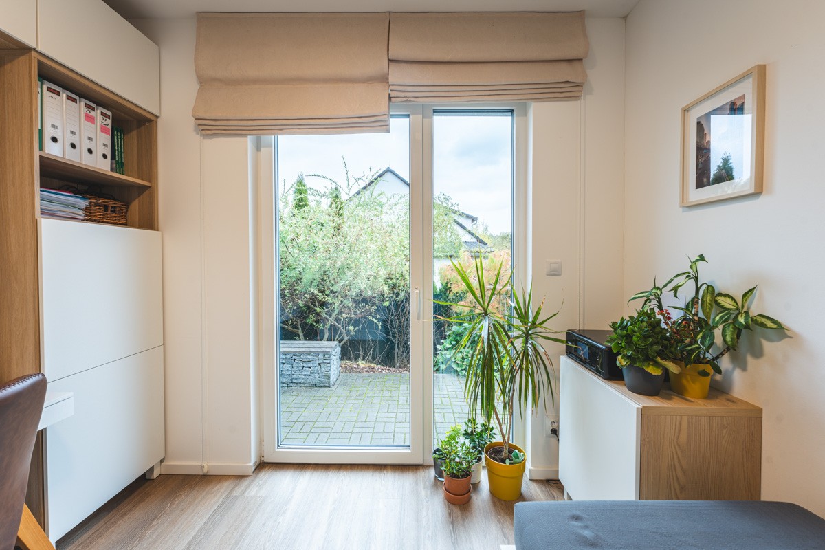 V pracovně a stejně tak v celém domě jsou velké prosklené plochy, které si vysnil pan majitel