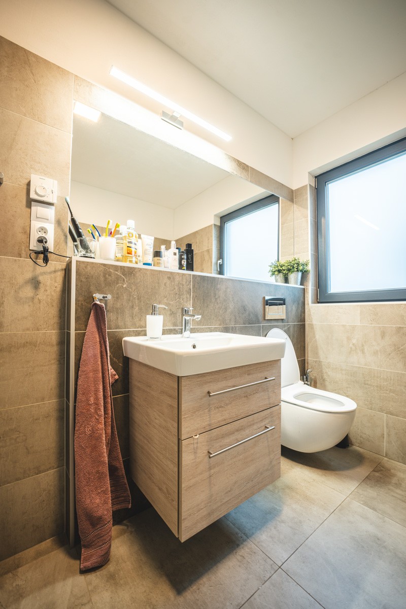 Moderní koupelna zaujímá 6,3 m2. Je navržená vedle ložnice, v zádveří obývacího pokoje