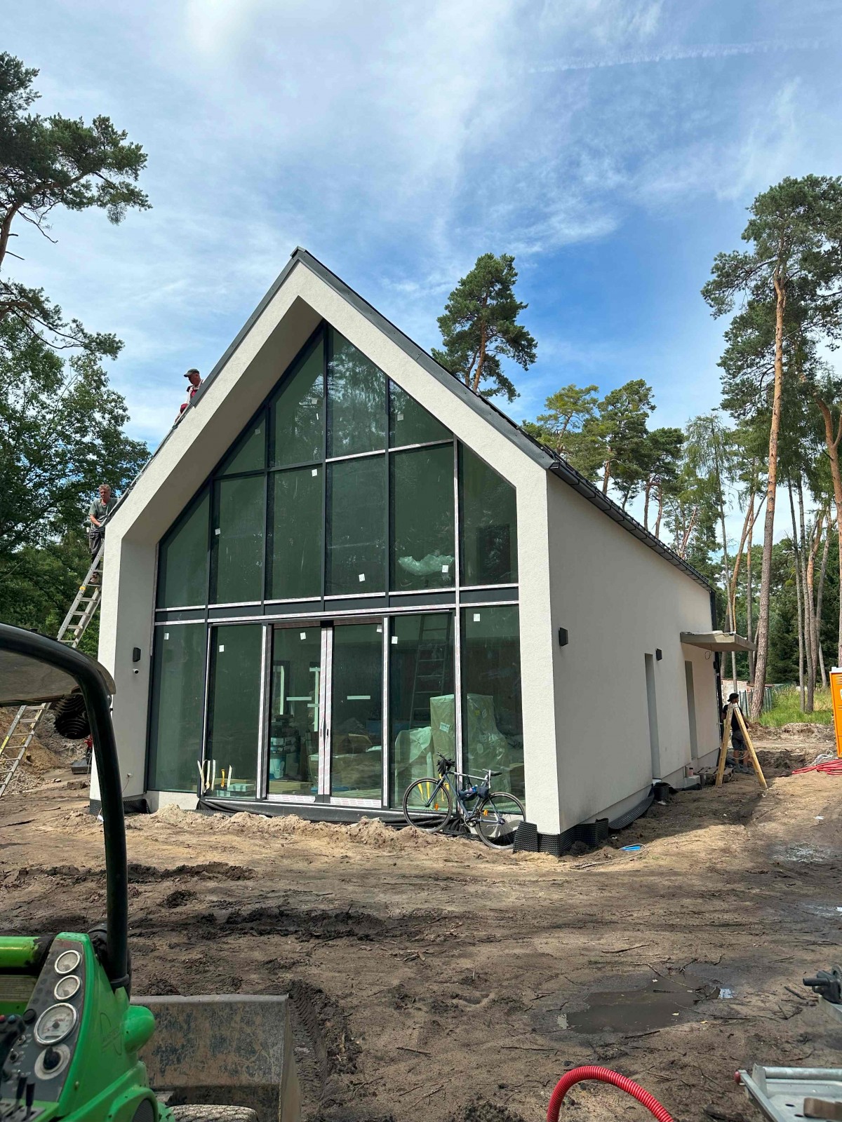 Mladá dvojice v sobě už nechtěla potlačovat touhu po větším klidu a vlastním domě, a tak se pustila do hledání parcely. Věděli, že na samotný dům budou mít velké požadavky, a proto hledali stavaře a stavební firmu, která by dokázala uspokojit i ty nejnáročnější nároky. A našli. Moderní dům s proskleným štítem vyrostl do roka a majitelé si nemohou spolupráci se stavařem z Prahy vynachválit.