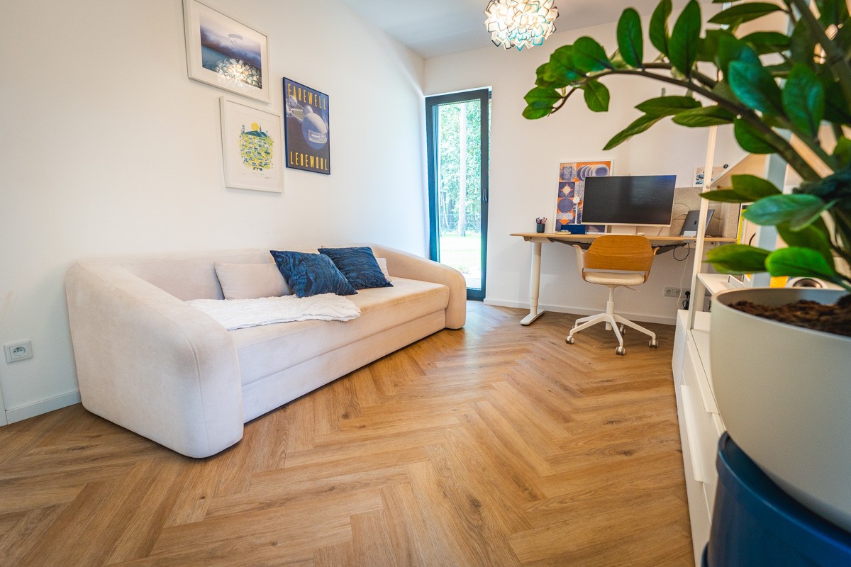 V přízemí se nachází moderní pracovna. Oba často pracují z domu, a tak tady tráví poměrně hodně času
