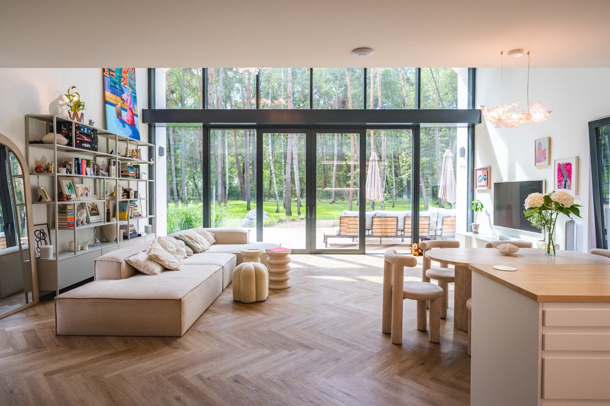 Hlavní místnost v domě se nachází hned za předsíní. Prosklený štít nabízí krásné výhledy do jejich lesa